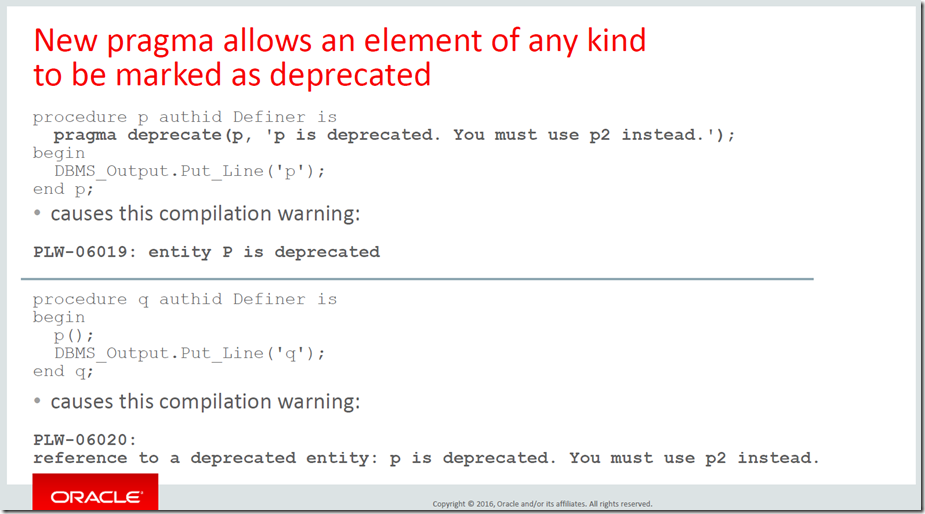 Bryn Llewellyn (Distinguished Product Manager, Database Division, Oracle) presented at OOW2016 on new features in PL/SQL in Oracle Database 12cR2. One of the features that stood out was a new pragma deprecate that can be added to program units such as functions and procedures inside packages. This pragma is used to mark a program unit at deprecated, which typically means: the program unit is still valid, but has been superseded by a better option and no new dependencies should be created on this deprecated unit. In fact, anyone still relying on this deprecated unit should start to consider using its replacement – especially when the code with the dependence is modified anyway for some reason.