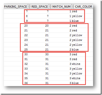 At this moment, we can start to appreciate the power of MATCH_RECOGNIZE.Extending the LEAD based solution to handle the extended rules for the RED YELLOW BLUE pattern is far from trivial. I have not given it a try – and using some aggregation partition by car_color I suspect is not extremely hard. But using MATCH_RECOGNIZE it is far easier to create a solution that is close to the requirement. By expressing the pattern definition as a regular expression: RED+ WHITE* YELLOW+ WHITE* BLUE+ (which is just the REGEXP equivalent of the rules stated before) we can use MATCH_RECOGNIZE to find the art in the car park like this: