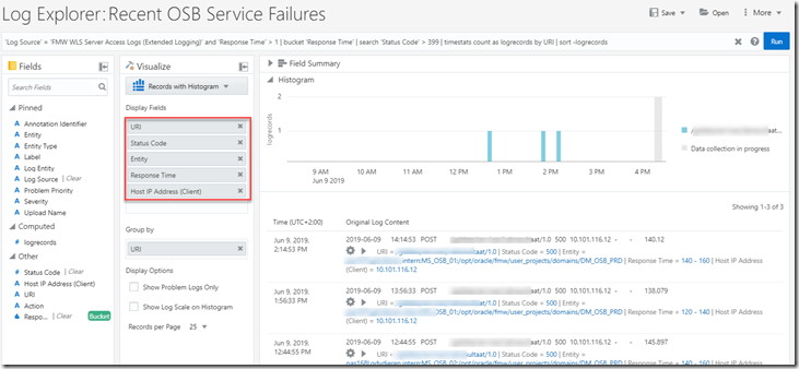 After creating the new association between the WLS Manager Server entities and the newly defined Log Source it will take a few minutes before log entries are parsed by the ELFF aware log parser. When the parser kicks in, we get what we are after: log entries with clearly identified URI, action, status and response time.