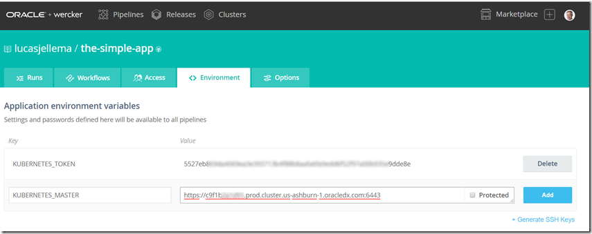 - generate a personal token in the Wercker account (to be used for Wercker’s direct interactions with the Kubernetes cluster)