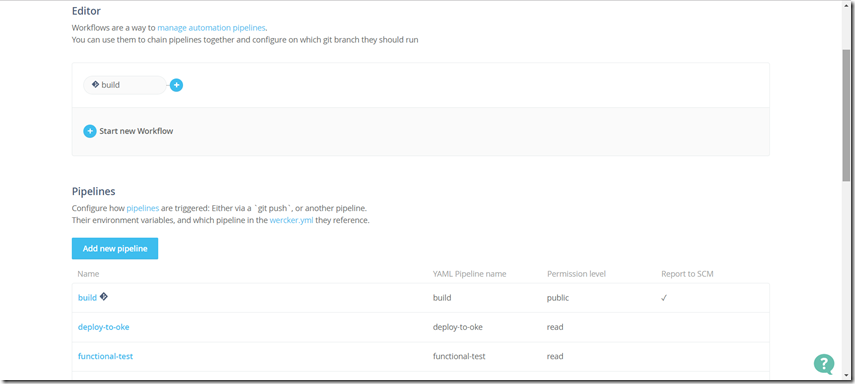 Click on New Pipeline for each of the build pipelines in the wercker.yml file. Note: the build pipeline is predefined.