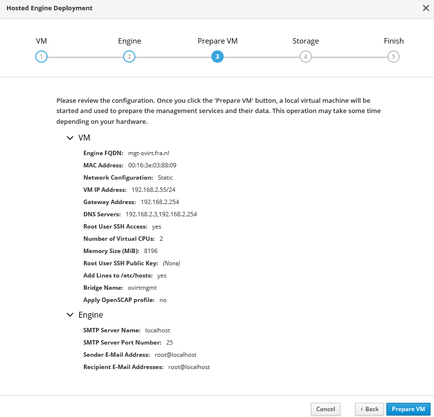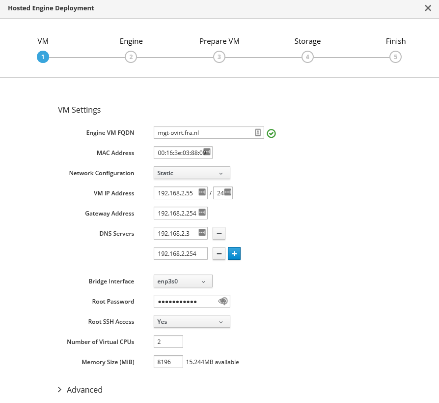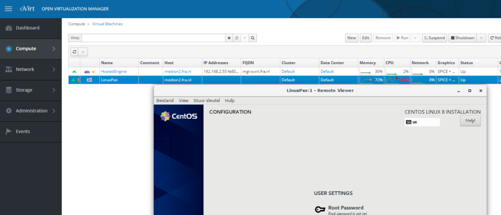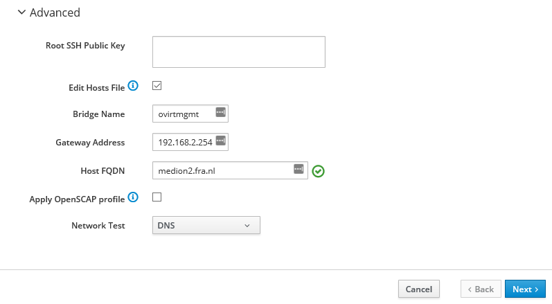 The wizard will help you with lots of defaults, most of them are good. I think the management VM has too many CPU’s, I gave it two CPU’s instead of the suggested four. The amount of memory for the HostedEngine VM is default 16Gb, I gave it 8Gb. You can use the (existing) root password to give access to this VM (as I did, see the images), but it is also possible to generate an SSH key first and use that. Unfortunately, it isn’t possible to use another system account than root to give access to the physical host.