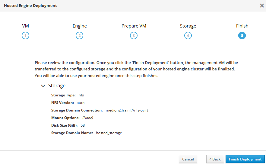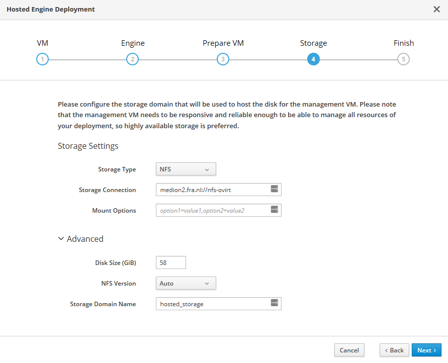When step 3 has been finished, the wizard continues with configuring the storage: you can choose between NFS, iSCSI, Fibre Channel and Gluster. In the advanced settings, there is a default of 58GB of disk space, but when you use NFS, the system will fortunately recognize the real size of the NFS partition and it will ignore the limit of 58GB.