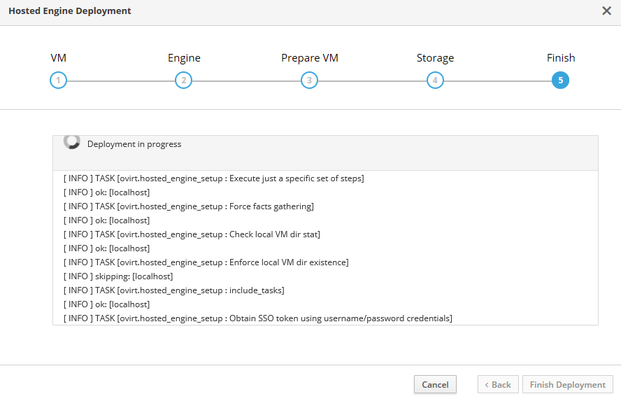 After checking the settings, you can start the setup. Please mind, that especially the step to install the ovirt engine appliance can take quite some time (on my machine: about 6 minutes). While you are waiting, you might want to look in the logs in /var/log/ovirt-hosted-engine-setup directory, where the detailed logs of the installation are kept. You will see that Ansible is used to do all kind of checks and to configure the software.