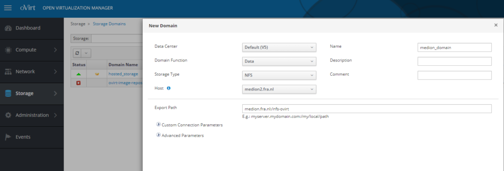 Now, add the storage of the second node to the oVirt environment: go to Storage > Domains, and add a new storage domain. I will call my domain medion_domain, the export path is medion.fra.nl:/nfs-ovirt.