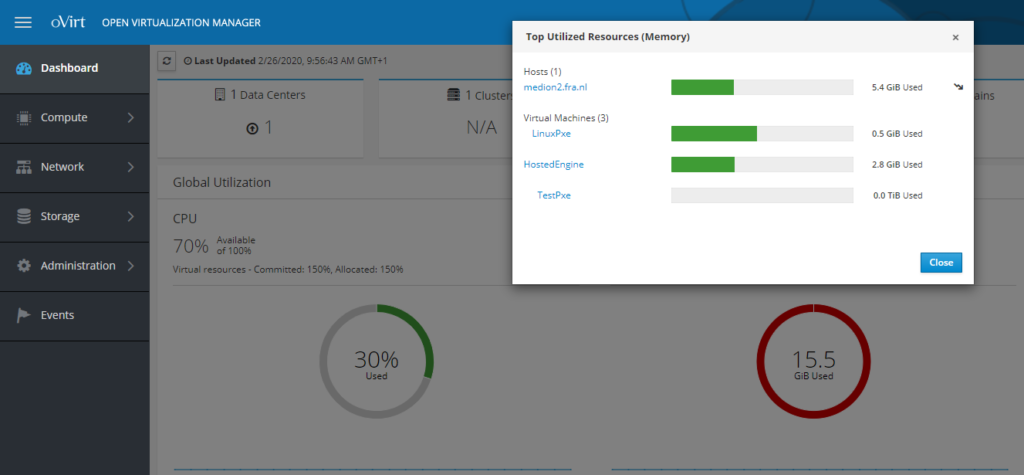 The dashboard of oVirt is impressive, let’s look at the main screen: