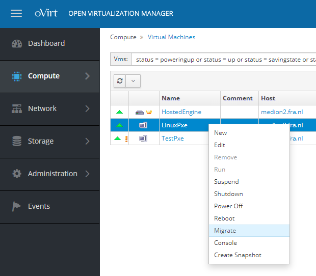 Let’s move a VM from medion2 to medion: go to Compute > Virtual machines, and select a VM. In the context menu, the option “Migrate” is visible, click on it:
