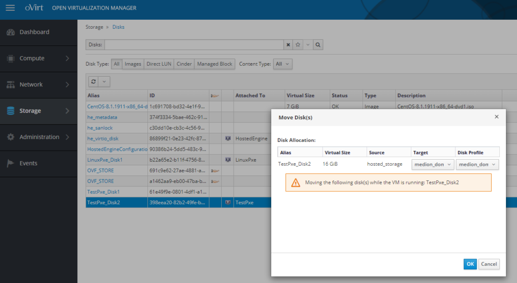 The action is, however, allowed. When I tried this, the disk was successfully transferred, though it took quite some time to do so. Unfortunately, the only thing you know is that the disk is locked, you don’t see any progress. This will be solved in the next major release, which is now in alpha stage. On the positive side: both the transfer of the VM and the transfer of the disk were possible without having to shutdown the machine.