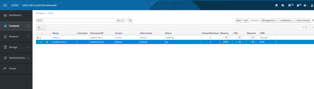 Go in the management website to Compute > Hosts, and click on the New button in the upper menu. Type the name of the host, the full host name (Full Qualified Domain Name, in my case medion.fra.nl) and the root password. When you pressed OK, then the new host is added, in state installing. When you want to see what is happening, go to the node and use tail -f /var/log/messages. After a few minutes, the second host is also up.