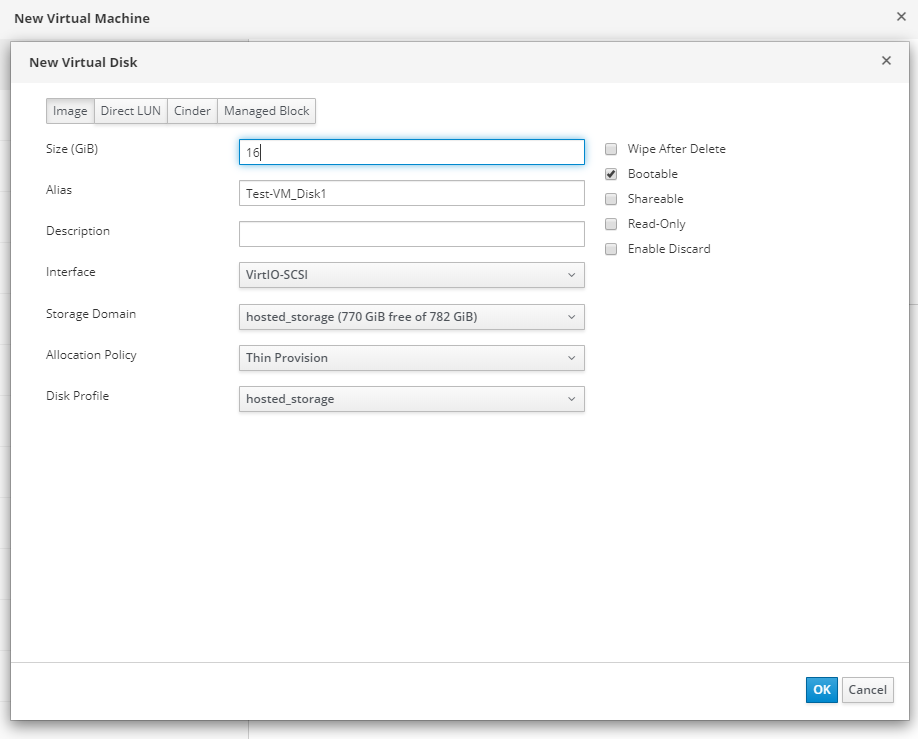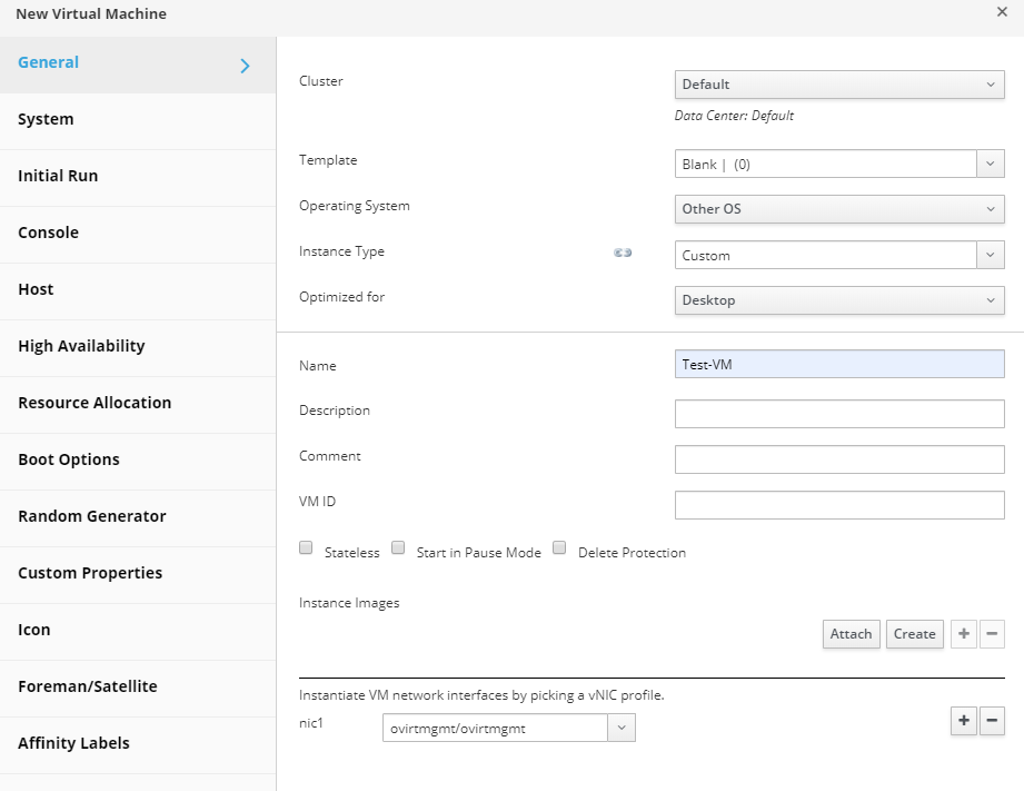 Now it’s time to start using the environment by deploying our first VM. In the left menu, go to compute > Virtual Machines and click on New. Don’t forget to add storage (via the Create button) and a network card on the first screen.