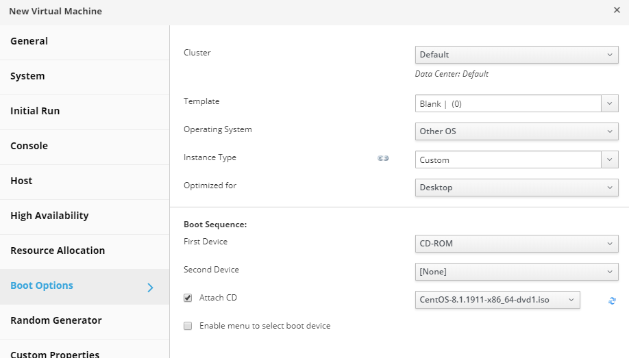 In the drop down window, you can select the ISO that you uploaded earlier. When you finish the wizard and start the VM (via the Run button in the upper menu), use the console button to download a settings file for virtual machine viewer.