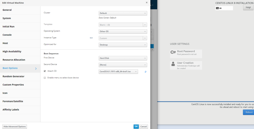 When you installed virtual machine viewer [2] and double click on the downloaded settings file, the console of the VM will be started. When the installation process asks you to reboot, you can change the settings of the VM (Edit button in the upper menu of the website interface, boot options, boot from hard disk instead of CD Rom) while the VM is running. Press Ok on the warning and press Reboot in the VM console to reboot the VM. The VM should now start from the hard disk, your VM is ready to use.