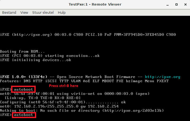 here. When the DHCP server without PXE configuration is found, iPxe will give an error. With arrow-up, you get the autoboot command again. Try this until your PXE server is found (in general: the second try).