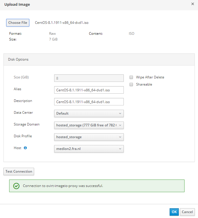 First, click on the button “Test connection”. When the connection succeeds, upload an ISO file (f.e. CentOS 8). When the test fails, retry to add the certificate to your computer.