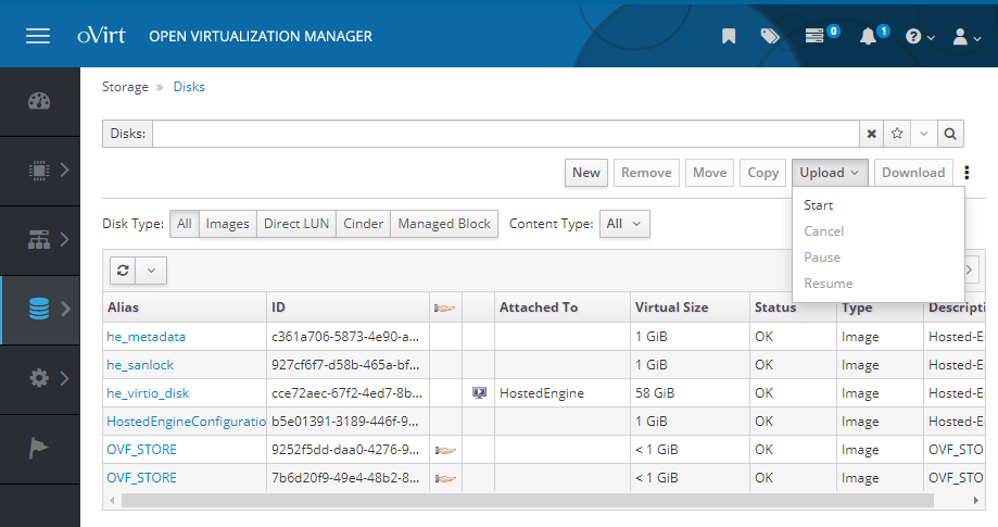 VM’s can be installed both from DVD (iso file) and PXE. When you deploy from DVD, the ISO must first be uploaded to oVirt. Go (with Chrome!) in the left menu to Storage > Disks and click in the Upload menu (upper menu) on Start.