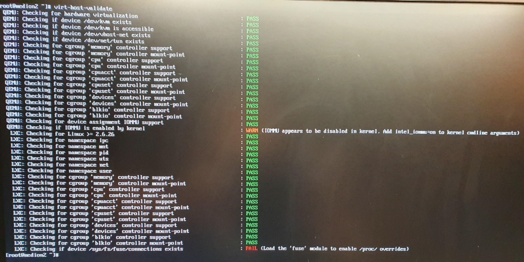 2) The fact that your hardware can run Windows with Hyper-V or VirtualBox doesn’t mean that the oVirt environment will run without further changes in the default settings. Fortunately, there is a very good tool to help you to analyse which settings should be changed: this tool is called virt-host-validate, it is installed when the cockpit and cockpit-ovirt-dashboard packages are installed. See for output of this command the photo below:
