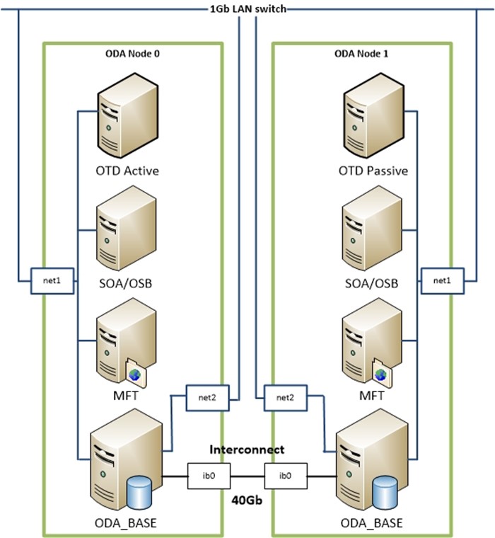 At a customer where I was asked to setup two ODA’s last year this was also the case. They bought two ODA’s with the standard configuration. Again the switches at the customer site supported 10Gb on fiber, but not on copper. Their copper switches supported 1Gb only. You can replace the InfiniBand card with a 10Gb fiber card, but this was not ordered and the ODA’s where already re-imaged by an Oracle Engineer. Ordering the fiber cards and re-imaging the ODA’s would delay the project too much, so I was asked to provide a solution with full bandwidth between the VM’s (with clustered FMW products) and the Oracle databases on the ODA_BASE.