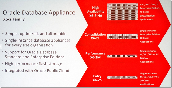 imageThe Oracle Database Appliance (ODA) meanwhile has seen a set of new models – of various shapes and sizes. Raw performance based on the latest generation Intel chips (the Xeon X6), extensive DRAM memory and all flash storage (NVMe) is the key theme of the ODA X6-2 family. The ODA starts at $18K list price for X6-2S.
