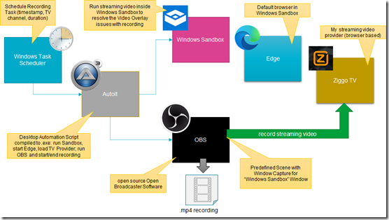 My motivation: show that I can do this (using AutoIt, OBS, Windows Task Scheduler an Windows Sandbox) and create a way around the limitation of my current TV provider (Ziggo in The Netherlands) that does not support recording programs any longer and offers on demand viewing for only a limited number of channels. I have a personal need for an easy way to make a recording of interesting programs and watch them at my convenience.