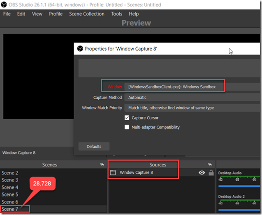 • run OBS Studio (Open Broadcaster Software) (in which I have created a Scene ahead of time with a Window Capture source for a window titled Windows Sandbox)