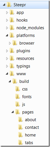The application is built for the browser platform. The result is found in the platforms\browser directory under the app root directory. The www folder contains the build result – in this case that folder is Steepr\platforms\browser\www.