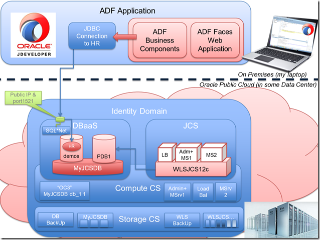 In the article you are reading right now, I will discuss the development of a straightforward ADF Web application with Business Components that access the HR schema inside an DBaaS database instance in the public cloud. After locally developing this application, we will deploy it to the JCS instance shown in the figure below and run it entirely inside the public cloud.