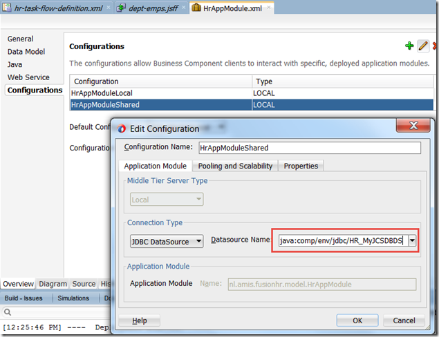 Before we can deploy the application to the JCS instance in the Oracle Public Cloud, we need to set up a JDBC Data Source that refers to the HR schema in MyJCSDB. The JNDI name of this data source is defined in the ADF BC Application Module configuration as shown in the next figure: