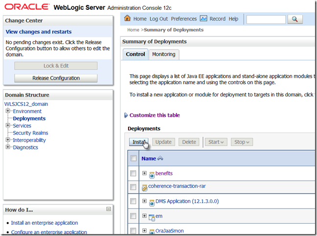 Open the WLS Admin Console. Open the Deployments node. Click on the Lock & Edit button to start an edit session.
