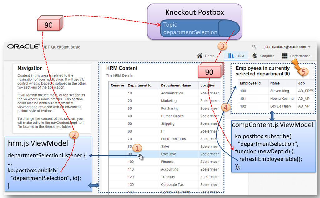 In a recent article (Extend Oracle JET with Table on REST API and Deploy to Node.js in Application Container Cloud) , I have described how I created a data bound Oracle JET application with a rich JET table component that reads its data from a REST API (that gets it from a DBaaS instance in its turn). The application developed in that article shows a table with Departments – read from the HR database schema. A nice next step it seems is to show a list of employees as well – and only the employees that work in the currently selected department in the departments table. When a new department is selected, the list of employees should be refreshed to align with the selected department.