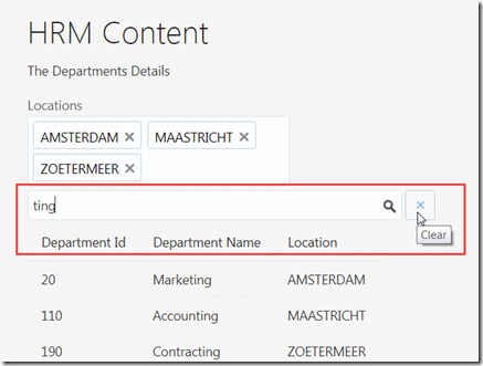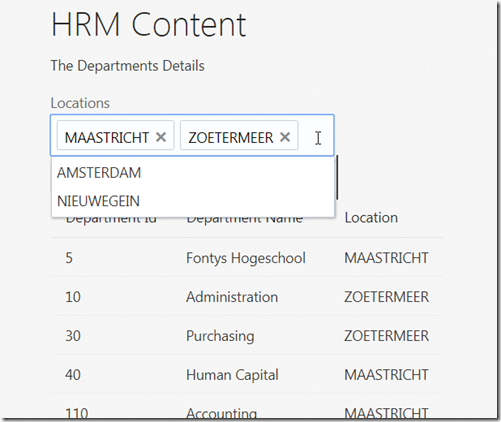 The objective of this article is to show how to add the capability to filter the records in this table – first by selecting the locations for which departments should be shown, using a multiselect widget. The filtering takes place on the client, against the set of departments retrieved from the backend service. The second step adds filtering by name using a search field. This level of filtering is performed by the server that exposes the REST API.