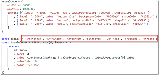 In this example, the data objects are cities in the Netherlands. They are to be ranked by population size. The axis with values is shown and the position of the city shape does not just represent the rank (in comparison with the other cities) but also the absolute size of the population.