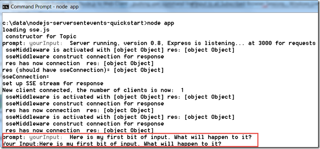 The Node application – apart from initializing an Express HTTP Server that handles incoming requests – for index.html and for the /updates path – also uses NPM package prompt to run a loop to request user input on the command line. Whenever the user types some input, it is published as an SSE event by the application and pushed to the SSE Clients: the browsers. The callback handler function in the browser received the SSE event and in this case simply writes the contents to the UI.