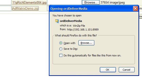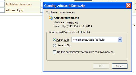Here we are downloading AdfMatrixDemo.zip but the browser calls it ordDeliverMedia.zip, a generic name used for all files we download.