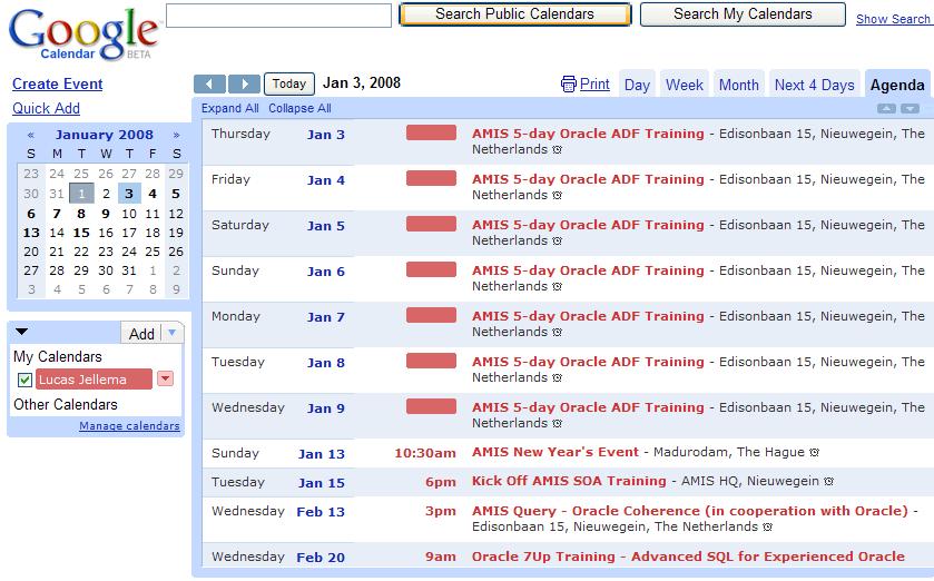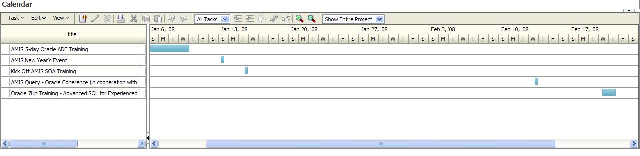 In this article, I will describe how I linked up an Oracle ADF Web Application – created in JDeveloper 11g Technical Preview 2 (I had an issue getting it to run properly in TP3) – with Google Calendar and used the ADF Rich Faces Data Visualization component Gantt Chart for an alternative presentation of the Calendar entries.