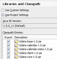 Create a new application, for example GoogleCalendarWebFrontend with an empty project – for example CalendarClientAndService. Create a lib directory under this project and copy the jar files in subdirectory googleCalendar\gdata\java\lib to this lib directory. Next add these jar-files, or at least these: