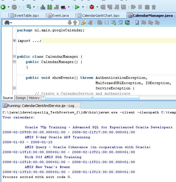 Note: when I tried to do the same thing in JDeveloper 11g TP3, I ran into issues: after deploying the application, it seemed that the Google Calendar API Service could not be reached (debugging showed that everything went as planned right up until the moment the Google service was accessed). I have asked for help on the JDeveloper 11g TP Forum, since I do not know what is causing this issue.