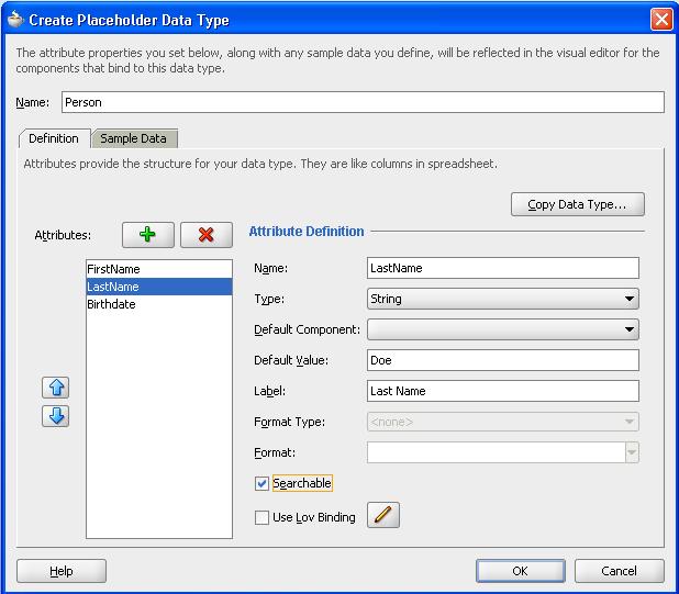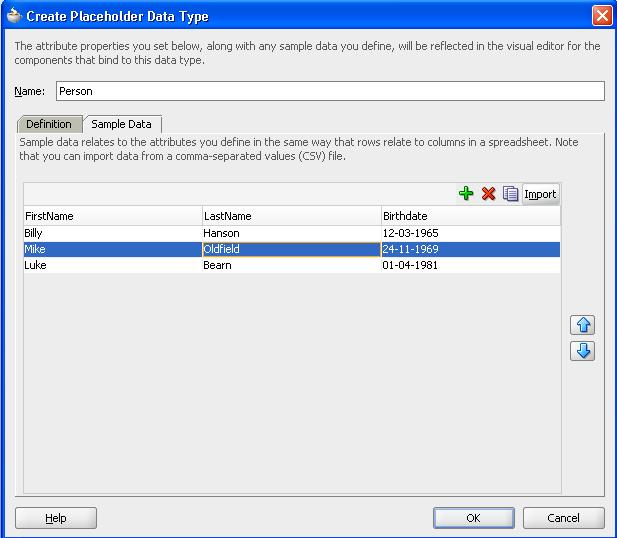 – create a Data Type under this Data Control – specify a name, the attributes and sample data (rows of data that will be displayed when the application is run with the placeholder data control still in place)