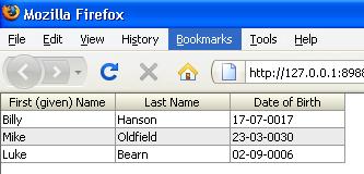 There seems to be an issue with the Birthdate column: the display format for Date Column is not correct, even though the display format was set to SimpleDate – dd-MM-yyyy. Maybe this format was not applied to the sample data as well. The format with which the sample data should have been entered is probably different from the dd-MM-yyyy format. Also note that in the current build of JDeveloper 11g I had an issue with ADF (editable) Table – dropping the Placeholder Data Control’s Person Data Type on the JSF page as an ADF (Editable) Table resulted in the strange phenomenon that in the browser (when running the page) three rows are visible – but no data is shown. So I can tell the table contains three records, but none of the cell values are visible.