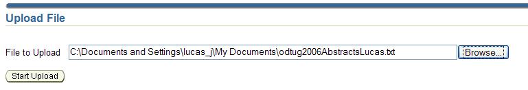 Now we can run the JSF page. We can press the browse button, select a file, press the Start Upload button and have the file uploaded to the application server. The FileProcessor Bean’s setUploadedFile method is invoked and the properties and contents are extracted from the UploadedFile object and set on the other bean properties.