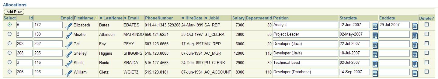 Note that when rendering, ADF Faces does not produce COLGROUP or COL elements, as I had expected and hoped for, but instead creates regular TR, TH and TD elements. Every additional level of column nesting results in an additional TR element – with the non-nested columns getting an increase in their ROWSPAN attribute.