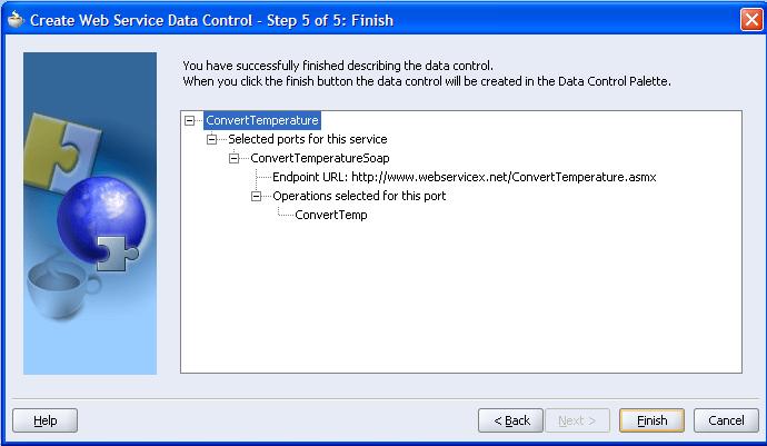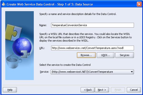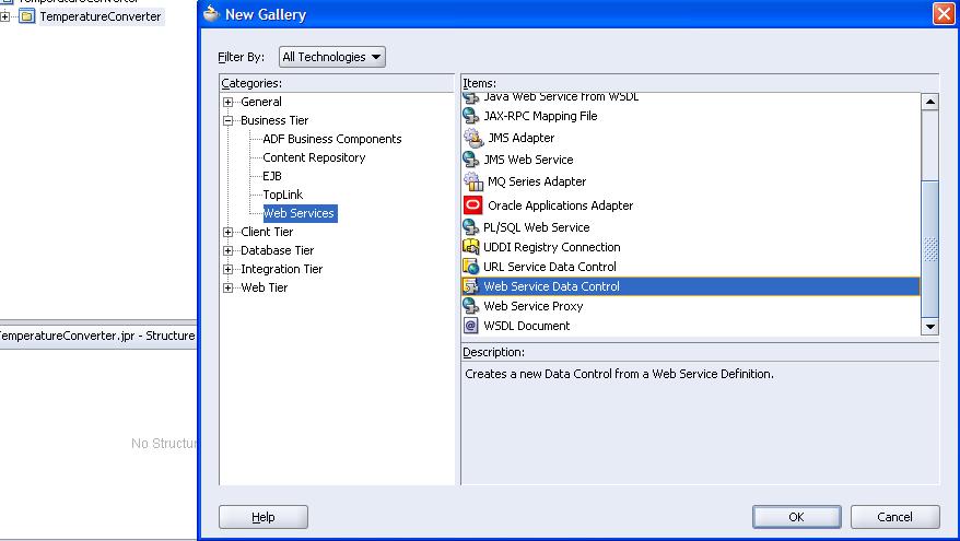 I will first create an ADF Data Control for a WebService (based on the WSDL). Using items bound to this data control, I will create a JSF page that allows users to convert temperatures. Unfortunately , we will discover that while calling the service works fine, it is way too slow. And given the fact that 80 degrees Fahrenheit today will convert to the same temperature expressed in degrees Celsius as it will be tomorrow. So calling the (slow) WebService over and over again with input parameters we already know the outcome for, we will attempt to find a smarter way of only calling the service if we really have to.
