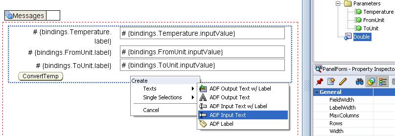 All page items that before were directly bound to elements in the Page Definition, are now associated with the temperatureConverterProxyBean. For example: