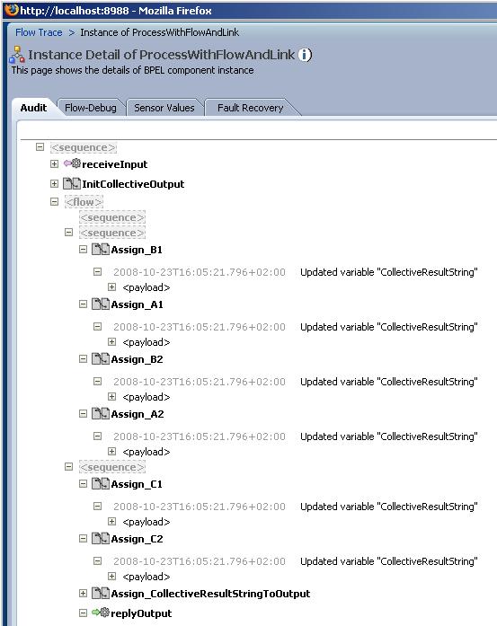 The result confirms our expectation – as well as the fact that Oracle BPEL PM implements the BPEL spec – B2 executes after C2 has completed and C2 starts only when A2 is done. The order of A1, B1 and C1 is not specified.
