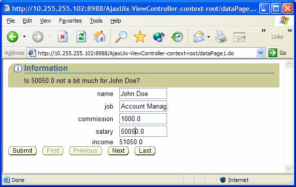 Run the Action DataPage1 from the Struts-Config.xml file: you will see the Edit Employee Form with navigation buttons and data for three employees. When you edit the salary or commission values and leave the respective fields, after a very short delay you will see the income being refreshed!