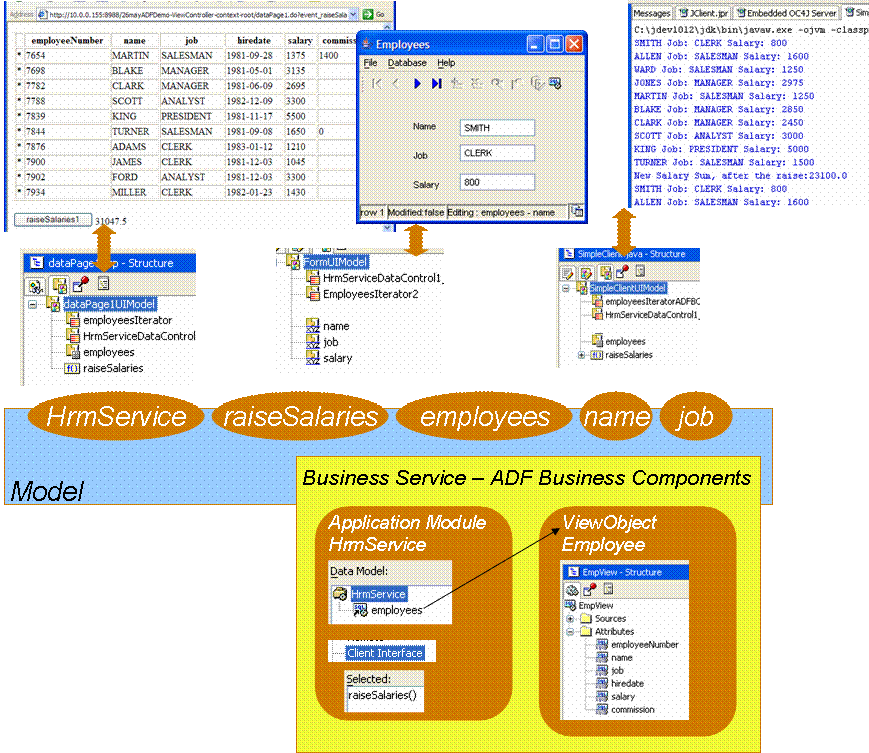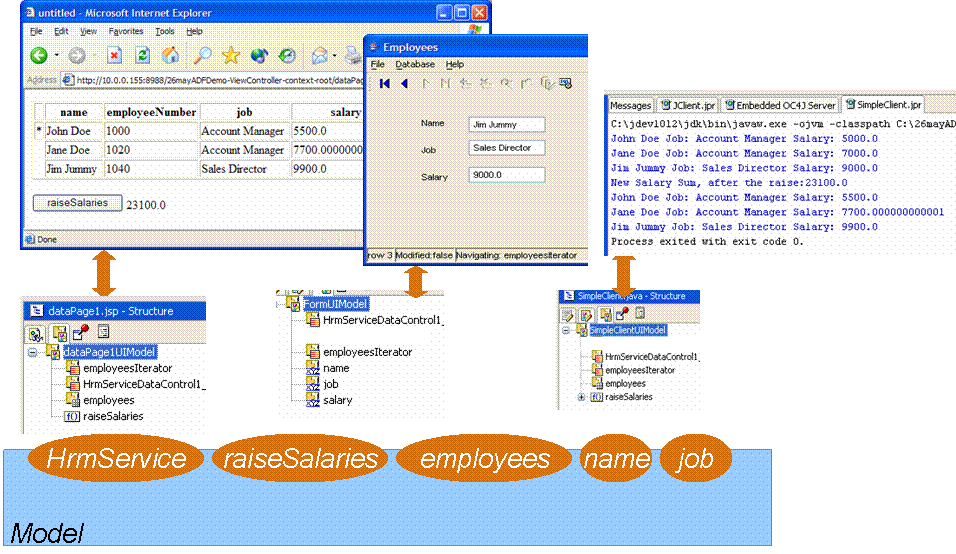 Then I created three applications: a ADF JClient application, a Struts/JSP application and a simple command line Java program. Each application has its own UI Model, based on one set of DataControls, implemented by the POJO Business Service. I demonstrated the actual running of each application.