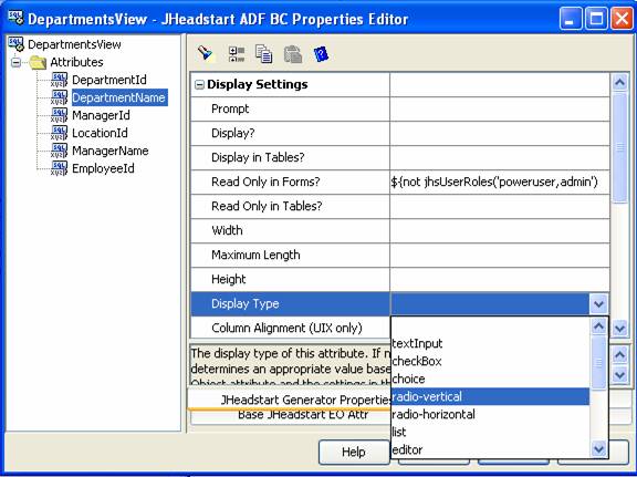 We can declaratively make groups and even individual buttons and fields accessible to users depending on the circumstances. Usually, these circumstances are the user logged in and the roles that user may have. However, the readOnly property of individual fields is governed by an EL Expression set on the ViewObject Attribute; this EL Expression may refer to the jhsUserRoles object but can also refer to any binding object or session or request attribute. You can use this facility to for example prevent updating of the ship date of an order when the status of the order is ‘shipped’. Peter also showed a Service Level property that can be used to define an EL expression for the entire application to set readOnly for every item; this can be used to support Viewer-mode; even though the application has facilities for manipulating data, when in viewer-mode, all fields are read-only. Note that Tabs for Groups a user is not allowed to see can be hidden from the Tabbar.