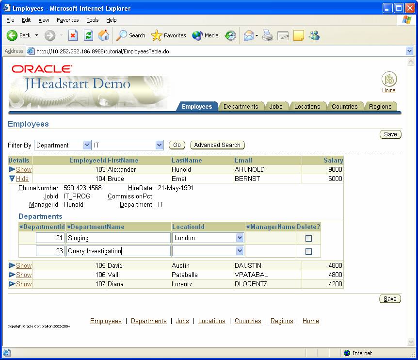 Another feature that is very simple to use – in fact, you get it automatically and have to manually switch it off – is support for Bread Crumbs. Bread Crumbs show the path the user has traversed to get to the current page. They will be supported for both UIX and JSP. JHeadstart 9.0.5 used to have breadcrumbs, though UIX only and static. The new bread crumb support is pretty clever: you include context in the bread crumb (for example Search Employees > Employees > Edit Employee Scott > Subordinates from Scott) The bread crumbs will be collected across complex navigations; for example if a group is nested for many levels, the bread crumb path will be built for all these levels. Bread crumbs cannot cycle: as soon as you visit a page that you had already visited, the previous visit and the path before that is removed from the bread crumb history.
