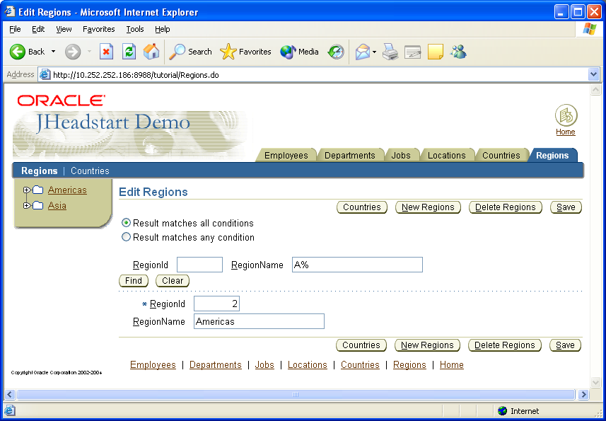 Peter showed us several Search enhancements. The advanced search region now includes radio buttons ‘Result matches all conditions’ and ‘Result matches any condition’ with translates to AND or OR conditions used in the SQL query that is constructed based on the search fields. A button to clear the search fields is now generated as well. The quickSearch (in UIX at least) has been made a lot smarter: when you select an item to search on from the quicksearch-poplist with search items, the display type of the selected item will be set as it is in the page. For example if you select to search employees on deptno, and you have specified that deptno is displayed as a choice with department name as label (and the deptno as value), you will now get that same choice in the quicksearch. The same goes for items with LOV, Calendar Window etc.