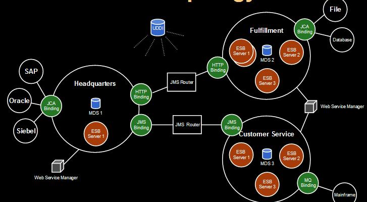 Like the (reusable) adapter-based services that are plugged into the ESB, the canonical data model – very similar to the InterConnect common view – and the management facilities that ensure reliability. monitoring and routing including Content Based Routing, for the message delivery. What the demo did not show is the (potentially) distributed nature of the ESB. One of the main differentiators between the BPEL container or traditional MQ systems and the ESB is probably the distributed character of the latter – in addition to the purely logical, abstract definition of services.