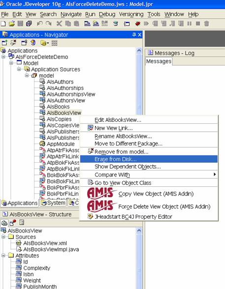 Now if we try to delete this ViewObject AlsBooksView with the normal BC4J Erase from Model operation: